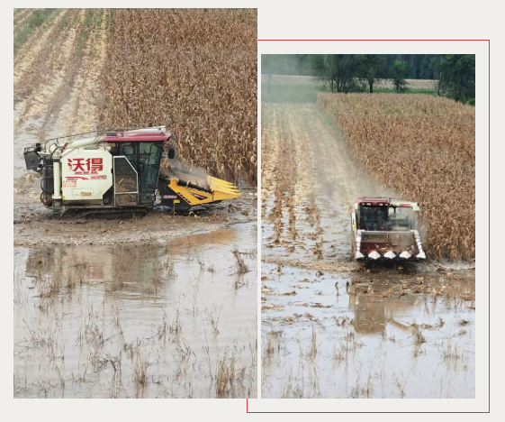 一位河南的種糧大戶看著沃得玉米機在自家幾乎淪為“池塘”的地里順利作業,激動地說:“眼看著玉米要爛在地里,心都在滴血。多虧了這臺‘鐵牛’,它一下地,我心里的石頭就落地了!沃得這次真是救了急了!”